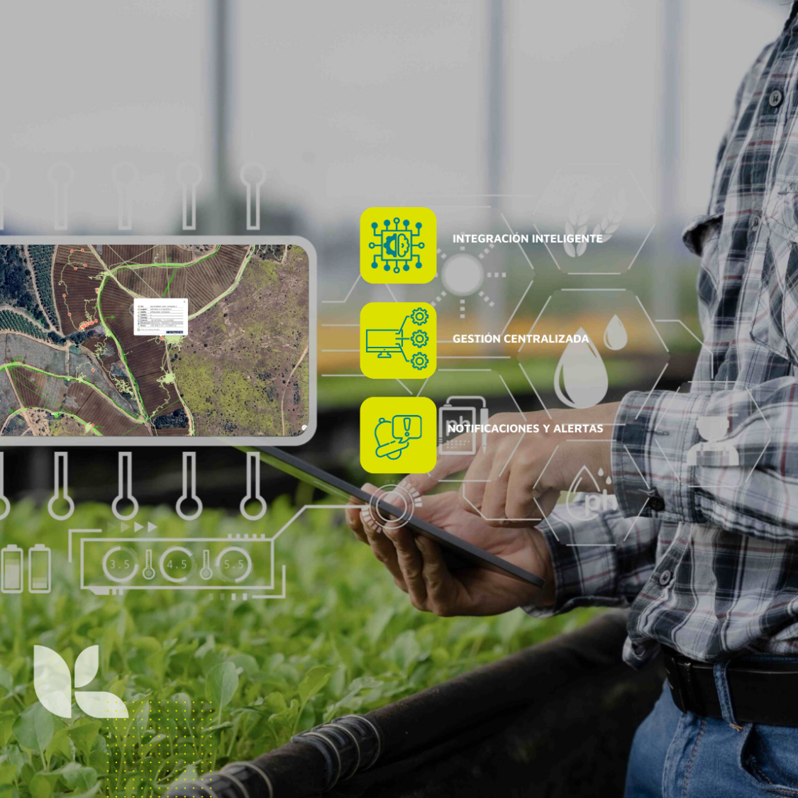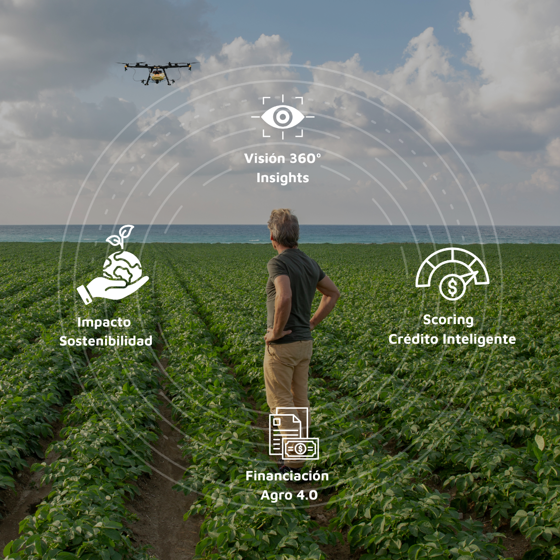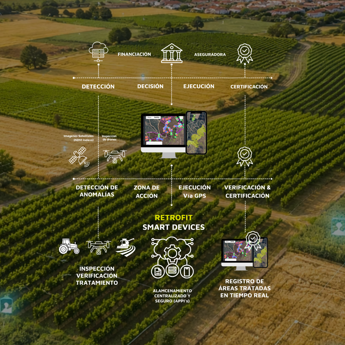 Visión integral conectada a satélites, drones y tractor para una trazabilidad operativa eficiente y en tiempo real.